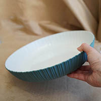 Generously proportioned serveware bowl has been inspired by banksia leaves and features a spiky edge outer profile which follows the curvature of the profile and dissolves into a smooth flat base. Neutral tone on inner to complement many different uses and highlight dark green on exterior.